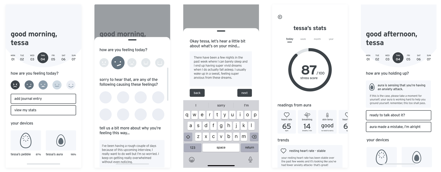 The final design includes a mobile application that supports two physical products in awareness and management of Anxiety Disorders. Use the interactive prototype to see more of the app, and click here to learn more about Pebble & Aura, the accompanying products.